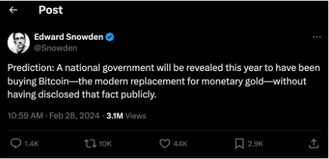 Nation-State Demand. El Salvador began buying Bitcoin in 2021 and owns 5,690 coins as of March 2024. The country also owns a minority stake in a $1B mining farm powered by Salvadoran company Volcano Energy. El Salvador executes a consistent dollar-cost average approach, accumulating 1 BTC per day. In March of this year, El Salvador transferred the majority of its holdings to cold storage housed in a vault within its own borders, a digital Fort Knox if you will. Prior to the transfer, the country was using American company Bitgo for custodial services, which sort of defeated at least one of the purposes of owning Bitcoin in the first place. Of course El Salvador is accumulating Bitcoin as a long-term store of value, but part of the impetus lies in the gradual diversification away from the US dollar.