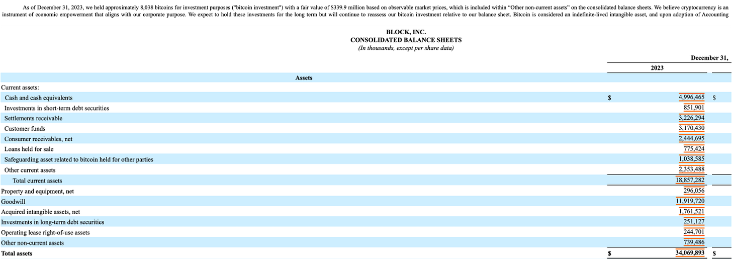 MicroStrategy blazed a trail here, effectively turning its entire business into a levered proxy of Bitcoin with over 214k coins. This is one side of the spectrum. The more actionable path is that of Block, which owns just over 8,038 coins as of the end of 2023. This represented ~$340mm in market value at year end, or 7% of the company’s ~5.0B cash balance. Today, those holdings represent ~$517mm in market value. The company’s 10K delves into its Bitcoin holdings: