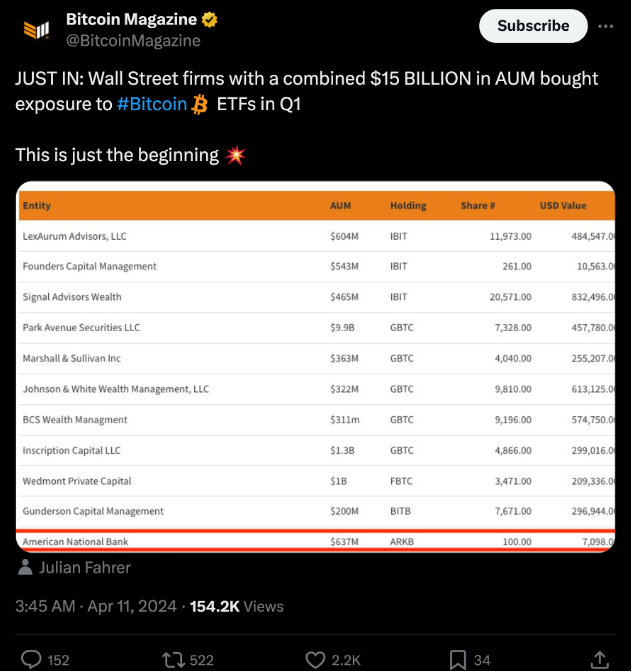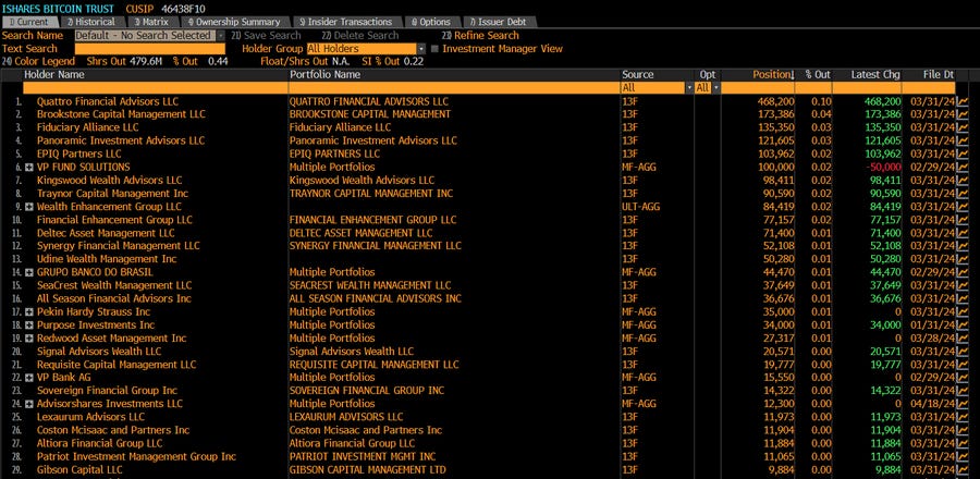 As Jim Bianco soberly points out, IBIT only has 27 13Fs with more than 10k shares (~$360k), collectively much less than 1% of total outstanding shares.