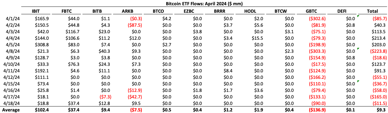 Grayscale Bitcoin Trust (GBTC), with its 150 basis point fee (vs. most issuers which are charging between 20 and 30 basis points), is currently the albatross in the space. In April, daily outflows from GBTC averaged nearly $137mm, because why would anyone pay 130 basis points more for exposure to the same asset?