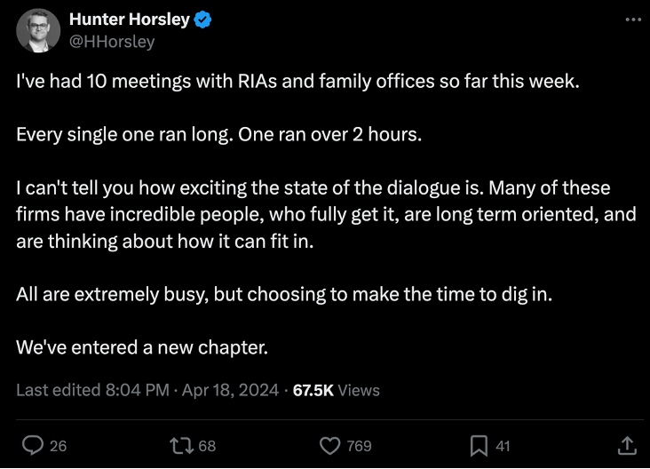 But, the majority of this contingent are buyers that would have never touched Bitcoin prior to ETF approval, either due to internal restrictions or reputational concerns. Rome wasn’t built in a day. It takes time to do the work, build conviction, and solidify portfolio allocations. The ETFs give RIAs the ability to consistently and compliantly accumulate.