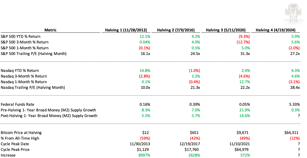 Comparing prior halving market and macro environments, May 2020 takes the cake as the frothiest. The halving coincided with Covid stimulus, emergency rate cutting, and rampant money printing that ignited a bubble-licious bull run. Broad money supply (M2), which reflects the total amount of money available for spending and investment purposes, grew nearly 22% heading into the 2020 halving, and another ~15% thereafter.
